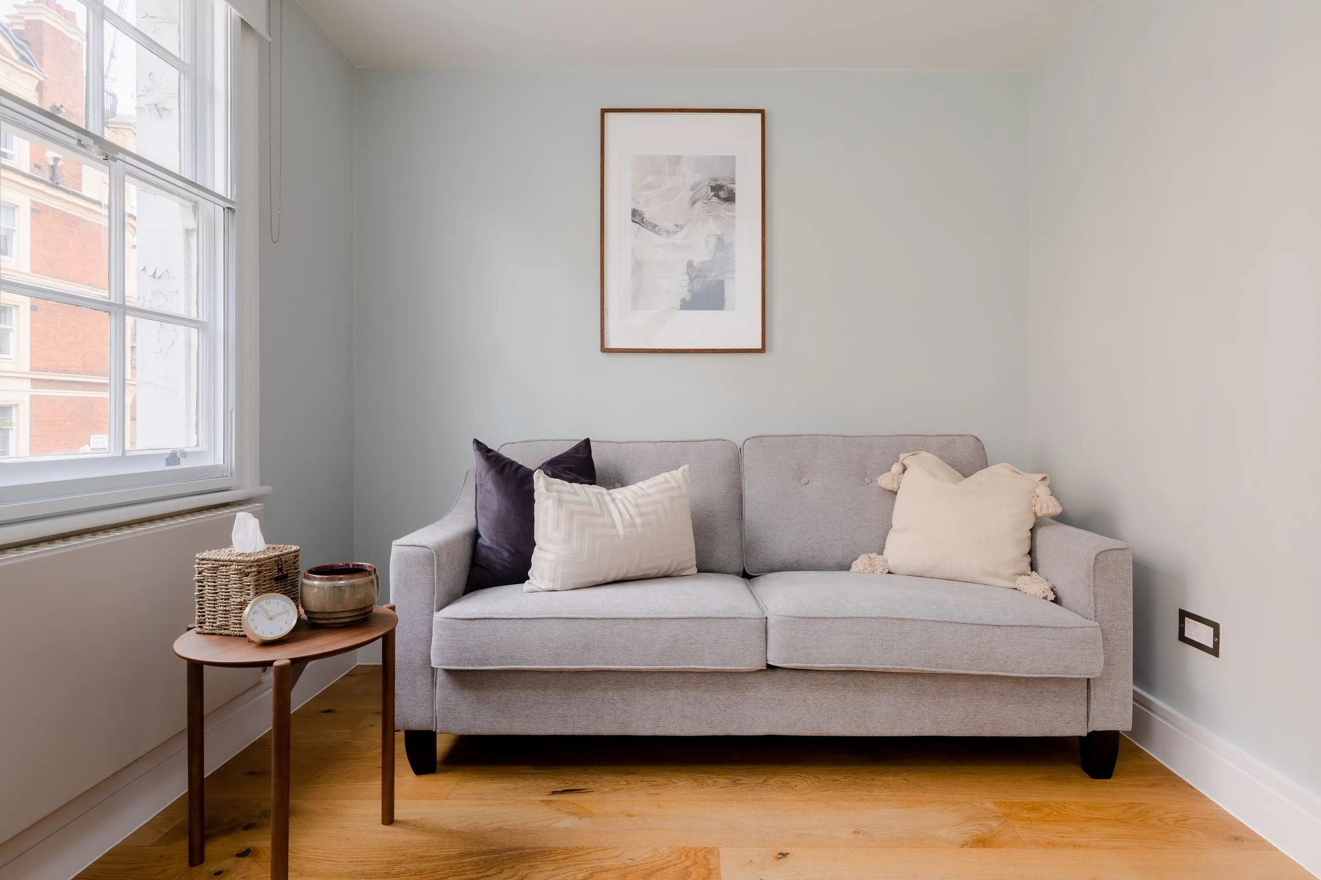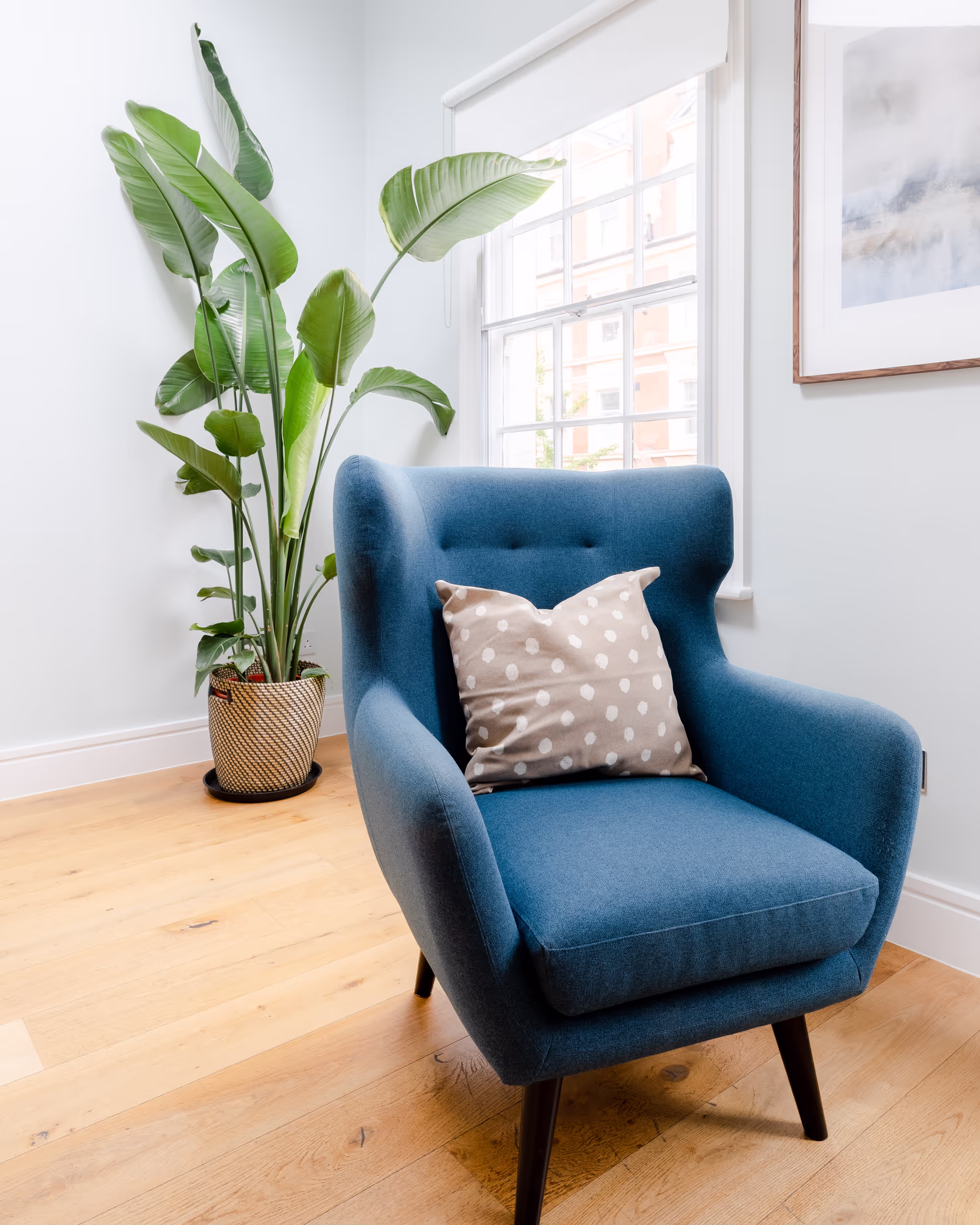 You are on the top floor, away from the hustle and bustle of Marylebone, in the Elm Room. Elm is subtle, stylish and composed in a wash of blue and grey. Suitable for couple and individual therapy, meetings, and Zoom calls.